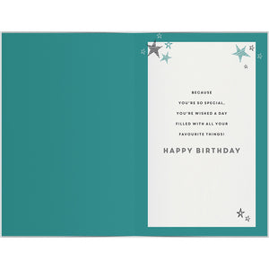 • Features a sentimental verse on the outside and "Because you're so special, you're wished a day filled with all your favourite things! Happy Birthday" on the inside.