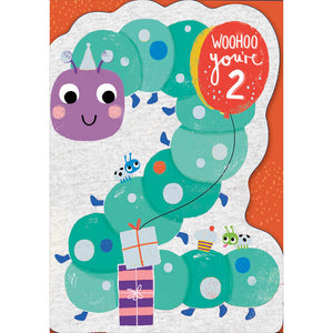 • Features"Woohoo You're 2" on the outside with a caterpillar illustration