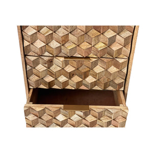The Geometric Collection is a designer led range which features a 3D cube pattern. Each piece is hand carved to produce an intricate finish - making each item unique. This collection is produced from solid mango, which is sourced from responsibly managed forests.