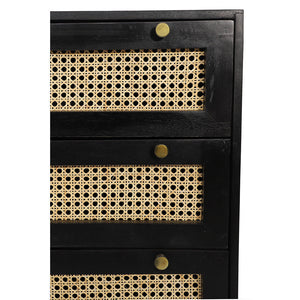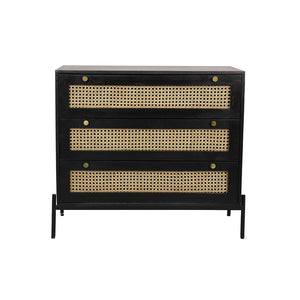 This 3 drawer chest of drawers offers an elegant storage solution. Black industrial style legs and gold pull handles complete the look. The top is perfect to display decorative pieces and would look great paired with other pieces from the Rattan collection.