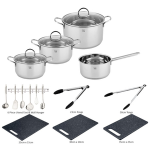 The TRIER line of cookware is constructed from stainless steel, boasting an energy-efficient capsule base and resilient heat-proof stainless steel handles. The silver pans are ideal for high heat situations and suitable for use on various stovetops (electric, induction, gas, and glass-ceramic). The safety glass lids, equipped with steam vents, provide visibility while cooking and maintain pressure balance. For added convenience, all pots are dishwasher-safe and oven-safe up to 210°C, making them ideal for serving multiple dishes simultaneously or for gentle cooking after searing. Enhanced with our Accessory and Utensil Bundle you are good to get on with creating culinary delights.