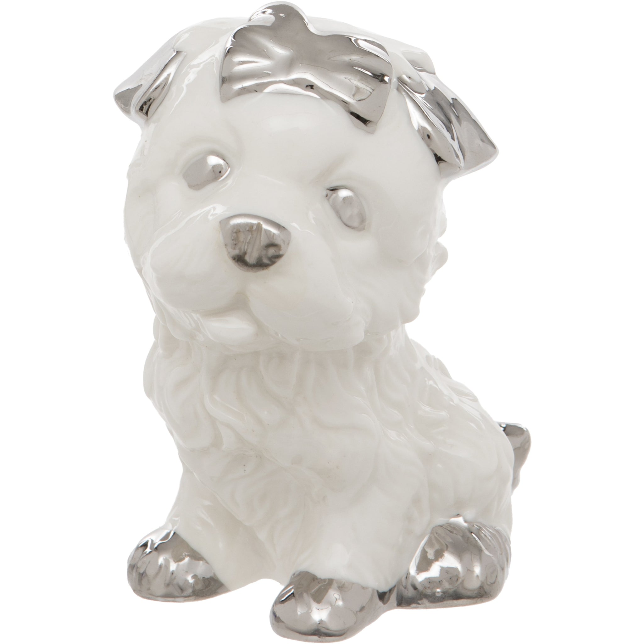 Add a touch of adorable elegance to your home with this White Ceramic Dog Figurine. The intricate silver bow and detailing on the ears and feet make it a perfect gift for any dog lover. Measuring at 12 (H) x 8 (W) x 10 (D) cm, it's a charming addition to any room. Bring joy and love into your space with this beautiful ornament!