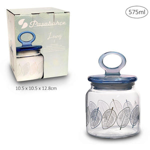 Perfect glass storage for the kitchen featuring a blue and green leaf pattern.
