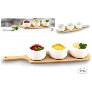 Three piece serving set consisting of 3 ceramic bowls and a bamboo tray. Perfect for serving appetisers, side dishes, tapas or sauces. The bowls are removable so are easy to clean after use. The sealed bamboo tray ensures mess-free transportation, making it a great choice for outdoor entertaining.