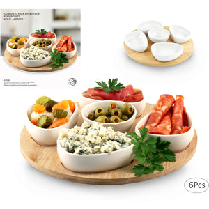 Five piece serving set consisting of 5 ceramic bowls and a bamboo tray. Perfect for serving appetisers, side dishes, tapas or sauces. The bowls are removable so are easy to clean after use and store. Whether you're entertaining guests or preparing snacks, this set offers a stylish and dependable way to serve up your favourite dishes.